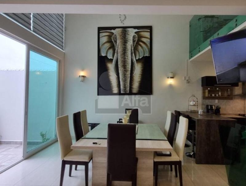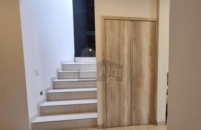 En planta baja cuenta con distribución abierta con sala–comedor (área de comedor a doble altura), piso español, pared de escaleras en granito, cocina integral con barra y tarja de cuarzo, medio baño, cuarto de lavado y bodega. El patio trasero ofrece una parte techada y otra al aire libre.